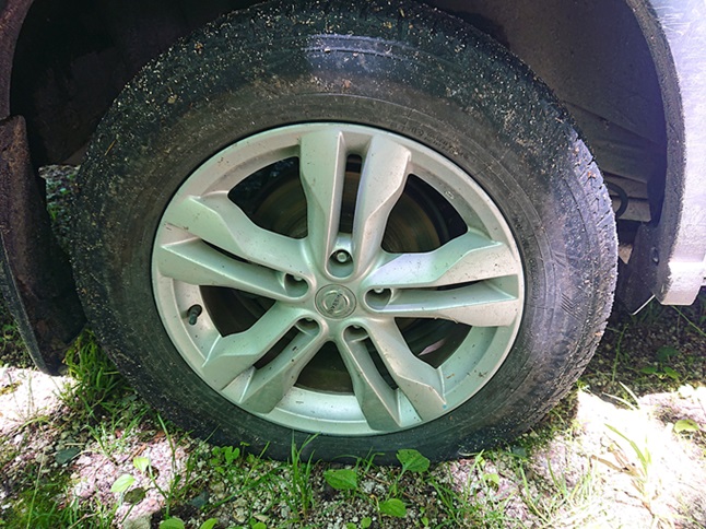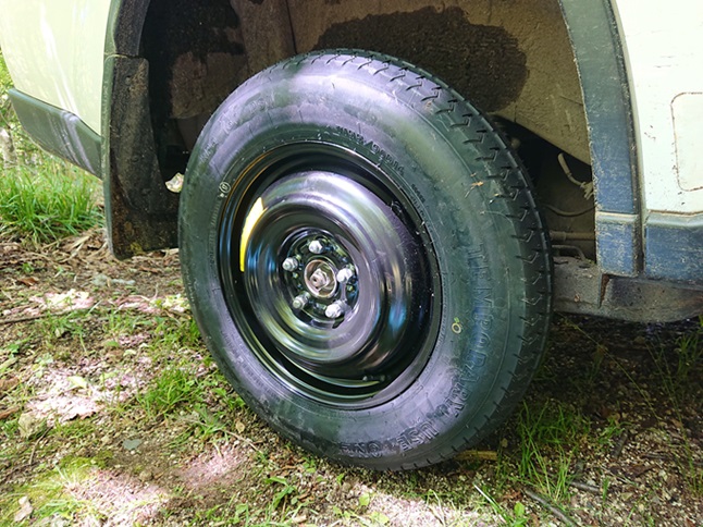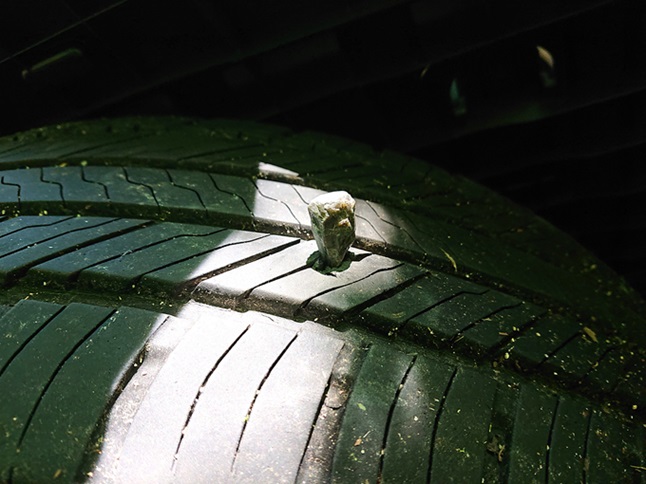 相当な山奥で携帯の電波がつながる所まで歩くと2時間半は掛かるので、迷わずスペアタイヤを引っ張り出したものの ボルトを外そうにも腕力ではピクリともしません(涙) ヤケになってレンチに乗っかり、勢いをつけて全体重を掛けたところ何とかボルトが緩んでくれました(^^) しかし、凄い石が刺さったもんだ(# ゚Д゚) |