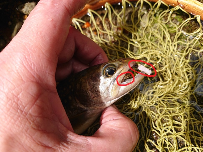 ここで珍事!? 合わせ切れしたポイントで、フライを結びなおして投げたところ一発でHIT♪ ランディングしてみてビックリ!、さっき合わせ切れしたコンパラダンがくっついていました(^_^;) まさかまさかの珍事でした(笑) |