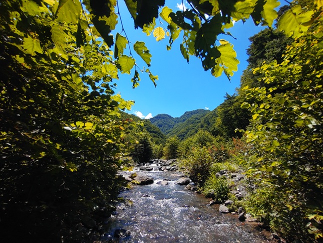 順調に釣果を伸ばし中間地点へ差し掛かったところで、左の崖上から小石がカラカラと落ちてきて・・・ ん!?落石かな?と、小石が落ちてきたほうを見上げたら・・・ クマさんが崖の斜面に生えた木にしがみついて、ワタクシを見つめていました(((( ゚Д゚)))) その距離目測10mも無いくらい?しかもその上にもう1頭いらっしゃるw 親子か兄弟か全く判りませんでしたが、足早に後退(汗) 少し離れたところでラッパを鳴らし撮影を試みましたが、木々の間で何かが動いている程度しか録れませんでした(笑) |