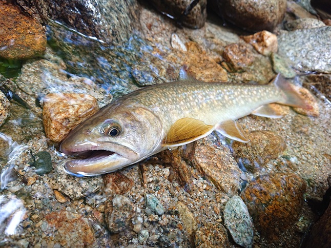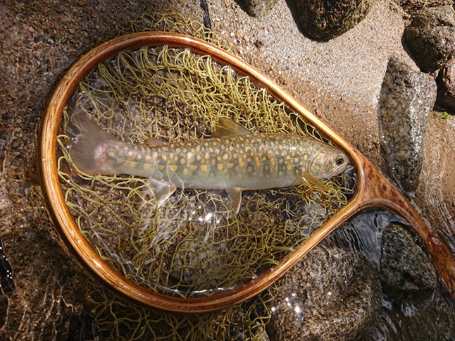 その間、Mさんは順調に釣果を重ねています(凄) 終盤、全然釣れないワタクシを見かねて、Mさんが見つけたイワナを狙わせてくれましたm(__)m 場所は浅い淵尻の対左岸、且つ流れの落ち際で、イワナの手前に岩があり 岩の向こう側を逆U字で20cmも流せば落ちてしまうような難しいところに定位(^_^;) がっ、自分には珍しく1発でヒット! |