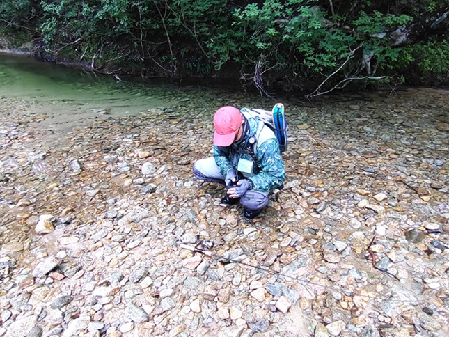ただ、進むにつれて何か様子がおかしい!? 絶対に居るであろうポイントに魚影が見えなくなって・・・ついに濡れた足跡発見(>_<) やむなく場所を変えて、ようやく待望の1匹に遭えました(喜) |