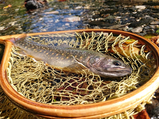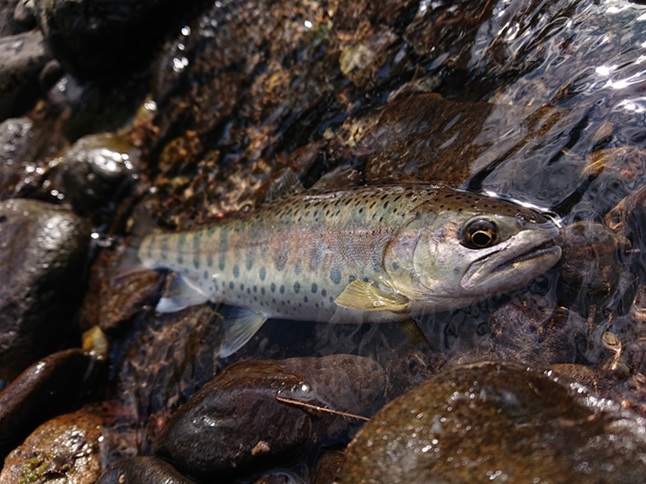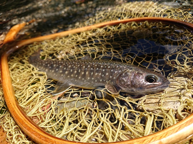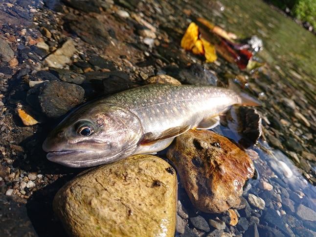 時間つぶしのつもりでしたが、良いサイズの本流ヤマメが釣れてくれました(喜) 夏ヤマメ、一里一匹というものの、1kmも歩いていないのに嬉しい釣果で〆 |