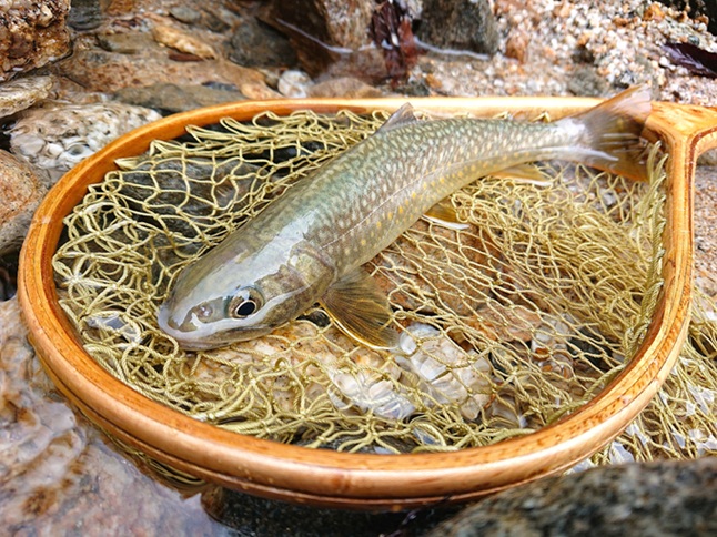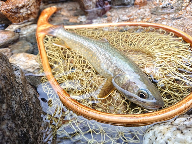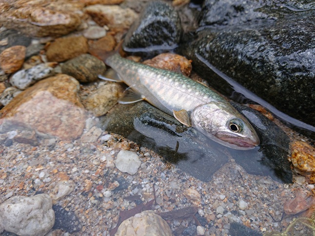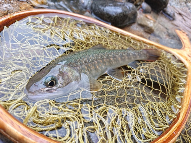 おまけに、いつ泣き出してもおかしくないような空・・・ 気温も低くて心配でしたが、何とかイワナ♪ |