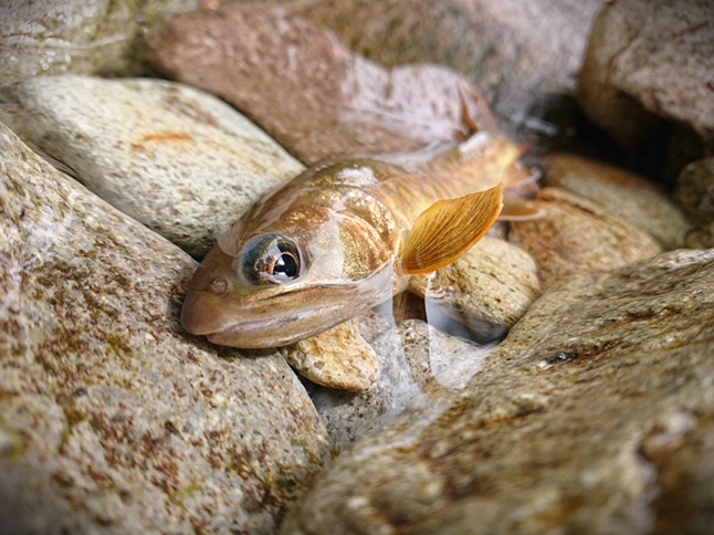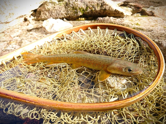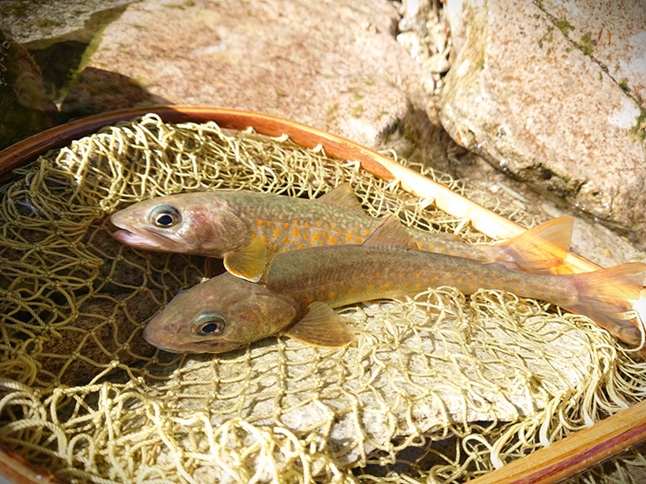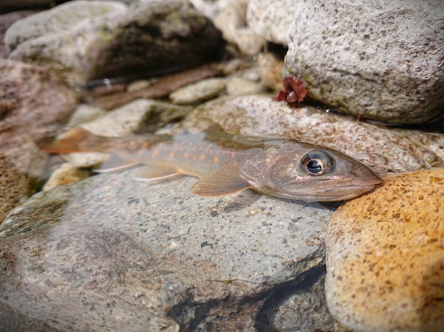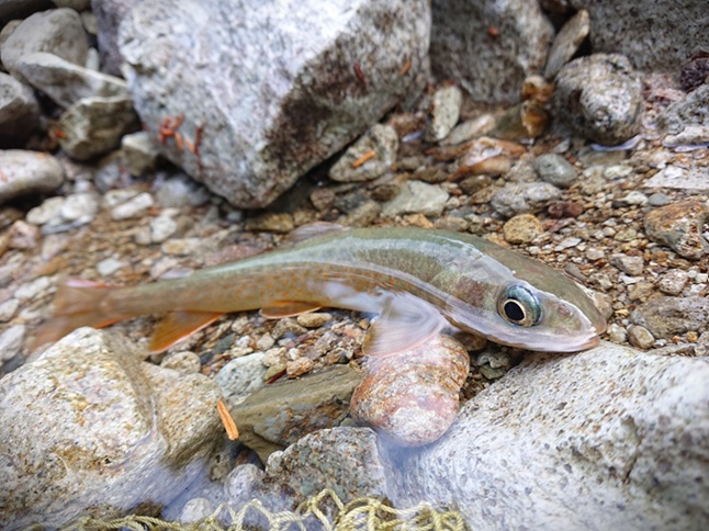 白点に見えるのはトラ柄模様が細切れになっているところなのか? 成長するにつれて消えていくのか興味深い模様ですが、たくさんのイワナに遊んでもらいました♪ |