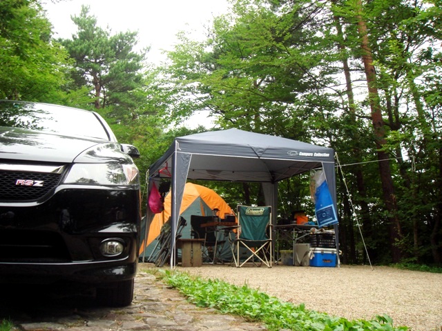 | サイトはこんな風に1区画毎に林で区切られ、お隣とも距離があって良い感じ! ちょっと雨に降られちゃいましたけど・・・ |